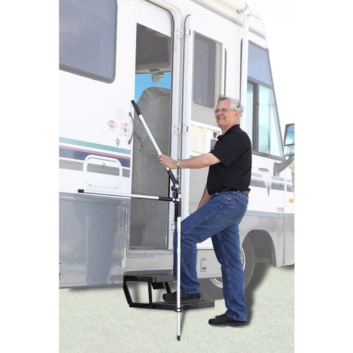 The upper door mount GlowGuide arm will run up to the door entryway, the lower step mount arm will run down and attach to the step system, the strut arm will run diagonally and attach either to the bumper or the back of truck campers, or to 5th wheels with slideouts and non-slideout applications. Due to all three arms being telescopically adjustable, the mounting location at the doorway for the upper arm and the mounting location for the strut arm as well as the step mount are not specifically set and can be mounted within a range to best suit each particular installation application.