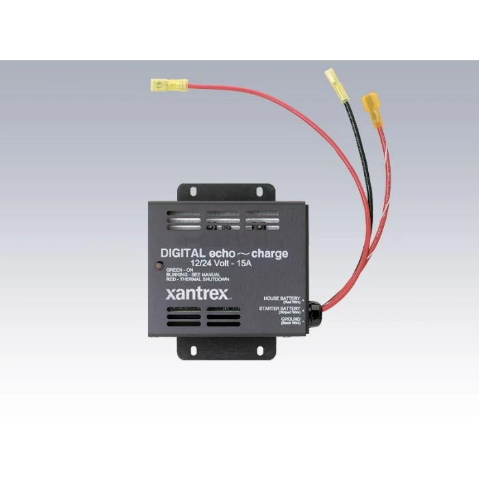 Xantrex’ digital echo~charge (part#82-0123-01) is designed to charge auxiliary or starting batteries from an inverter/charger or other charging source with limited voltage drop. The Xantrex echo~charge detects when the house battery bank is being charged and directs a portion of the charge current to auxiliary or starting batteries. The maximum charger current offered by echo~charge is limited to 15 amps.